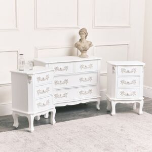 This Antique White 4 Drawer Chest of Drawer & Pair of 3 Drawer Bedside Tables from the Pays Blanc Range is a stylish storage set, perfect for placing in a bedroom, living room or hallway space. Made of wood, this set has an antique white finish, ornate festoon carving and a brushed gold finish. A beautiful, well crafted bedroom set that could blend into a wide variety of rooms and interiors. A great choice for those wanting to add a touch of French luxury to their home. Ophelia & Co.