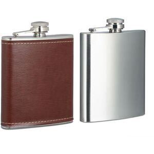 Thanks to their compact size, these hip flasks in a set of 2 are ideal for travelling. Simply fill the pocket flasks with a drink of your choice and enjoy unadulterated water, juice or spirits from the tasteless stainless steel flasks. Thanks to the classic curved design, the 200 ml mini hip flasks fit in any jacket pocket. The brown imitation leather cover not only enhances the look of the hip flasks, but also makes them a pleasure to hold. Mini hip flasks in detail - Dimensions H x W x D: approx. 12.5 x 9.5 x 2.5 cm - Opening diameter: approx. 1.2 cm - Volume: approx. 200 ml each - Weight: approx. 120 g each - Material: Stainless steel, plastic - Colour: Brown, silver Small hip flasks in a set of 2 - Made from high-quality, tasteless stainless steel - Compact size, ideal for travelling - Fits in any pocket - Clip closure secures the contents of the pocket flask - Brown imitation leather for a classic look - For water, juice, spirits and much more - 200 ml volume Included in delivery
