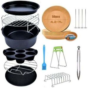 Our kits offer a complete set of accessories for your air fryer, including everything you need for cooking, without spending a lot of time and money on individual purchases, thus giving a good impression of your kitchen. Perfect for your air fryers. By purchasing air fryers of different sizes, you won't waste space in your air fryer, enjoy the fun of cooking, and meet the needs of the whole family. If you love cooking, don't miss the opportunity to own it! 11 accessories for the air fryer: The accessory set includes a air fryer bucket; Cake, a pizza dish, a metal grill, a grill stand, a bread grill, a cake pan, a silicone holder, an oil brush, a food clamp, an anti-scalding clamp, and 50 sheets of parchment paper. PERFECT COMPATIBILITY: Air fryer accessories are universal and perfectly compatible with most brands of air fryers from 3.7 to 5.8 QT. Enjoy healthier and more delicious fried foods every busy week. Dishwasher safe: All air fryer accessories are included. Made from
