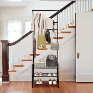 🧥FULLY FUNCTIONAL COAT RACK: With 16 coat hooks and 3 tier shoe rack, the coat stand helps you keep your entryway neat and tidy, keep your clothes and items organised and easy to access, satisfy your a variety of storage demand, large capacity, space saving, concise and convenient. 👜STABLE & SAFE: With 4 adjustable feet, the free standing coat hanger and shoe bench can stand perfectly stable on carpets or uneven floors. The bottom non-slip pad can slip and protect your floor from scratches. 🧣SOLID CONSTRUCTION: Strengthen and thicken steel pipe with matte finish, adopt high-end automobile painting process, health and environmental protection, no pungent smell. Rustproof and wear-resisting, stronger bearing capacity. 🧤WIDE APPLICATION SCENARIOS: The coat hat rack is suitable to be placed in the porch and behind the door. It is convenient to receive shoes, clothes, hats, bags, scarves, umbrellas, etc. Suitable for office, home, shop, etc. 📐EASY ASSEMBLY & DISASSEMBLY: Size: