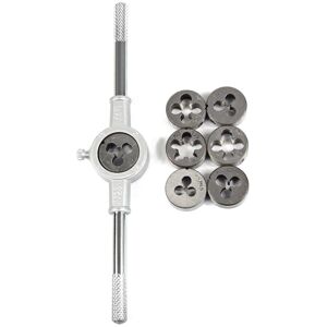 Specifications: 190mm (1") die for 17mm to 20mm capacity, with an adjustable screw. Included metric round die sizes: M3 x 0.5, M4 x 0.7, M5 x 0.8, M6 x 1.0, M8 x 1.25, M10 x 1.5, M12 x 1.75. Application: For general purpose threading. Perfect for re-threading existing threads in hard materials like metal, or creating new threads in soft materials like plastic. Great for maintenance and repair work. Features: The die stock offers good wear resistance for long service life. With 4 adjustable screws, the die stock can securely hold the round dies. The round die features a tapered locking hole. Easy to Use: The groove The die positioning plate should be aligned with the fixing screw in the middle of the die key, and the screw should be inserted into the die slot and tightened. Tips: It should be reversed every 1/4 to 1/2 turn to facilitate the discharge of the chip from the chip hole. Appropriate lubricating oil should be added to the cutting edge of the die when tapping threads.