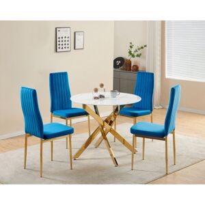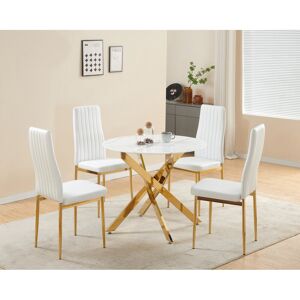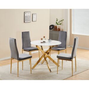 Elevate your dining space with the perfect blend of luxury and contemporary design. The Round 4-Seater Dining Table is a stunning centrepiece designed to bring modern sophistication and timeless elegance to your home. Featuring a white marble-effect 10mm tempered glass top and striking gold-finished metal legs, this table offers both durability and style. The artistic, nest-like leg structure not only provides exceptional stability but also creates a bold, sculptural focal point for your room. Adjustable levelling feet ensure the table stays perfectly balanced on any surface, combining practicality with standout design. Comfortably seating up to four, it’s ideal for family meals, special occasions, and stylish entertaining. Fairmont Park Chair Colour: Black