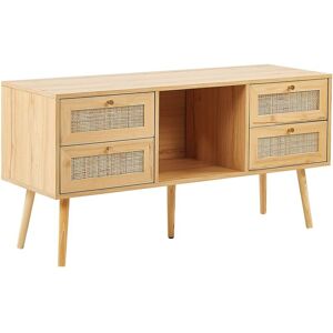TV Storage Unit with Rattan Fronts for a TV up to 70ʺ. This TV stand is a perfect addition to complete your living room setup with. It features two roomy cabinets, offering ample storage for your entertainment essentials while maintaining a sleek appearance. The open shelves provide a perfect display area for your media devices or decorative pieces, and a discreet cable slot keeps your cords organized and out of sight. Supported by sturdy rubber wood legs and adorned with elegant, gold pulls, the piece seamlessly combines style and utility to enhance any living room decor. Details: Product Type: TV Stand Style: Rustic General Color: Black, Beige Material Type: Engineered Wood Main Material: MDF Additional Material: Particle Board Frame Material: Engineered Wood Legs material: Wood Top Material: Engineered Wood Doors Opening: Standard Drawers: No Finish: Melamine Number of Doors: 2 Shelves: Yes Dimensions: Depth: 40 cm Width: 150 cm Height: 52 cm Weight: 24 kg Shelf Weight Capacity: 10