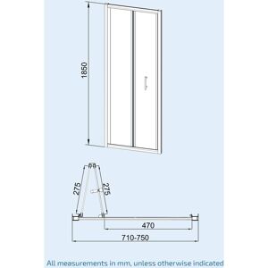 Made from 1 mm aluminium profile and coated in a stunning chrome finish along with stainless steel handles. The glass panels on the shower enclosure are created from 6 mm tempered clear glass. All our bi-fold folding shower doors and glass side panels are delivered with a 10-year Warranty. Bi-Fold Glass Shower Door Specifications Height: 1850 mm Width:710-750 mm Concealed design bi-folding shower enclosure cubicle door The bi-folding door is manufactured from 6mm toughened tempered safety glass Highly durable and easy to clean glass coating Dazzling chrome finish profile Strong build push release double rollers for smooth operation Quick release door system, easy removable wheels for easy cleaning High quality stylish stainless-steel handles, polished chrome finish Quality finish ensuring long term durability Chrome plated metal seal strip Passed multi waterproof tests - the best waterproof guarantee Power shower proof Universal; left or right hand fitting 40mm out of line inward wall