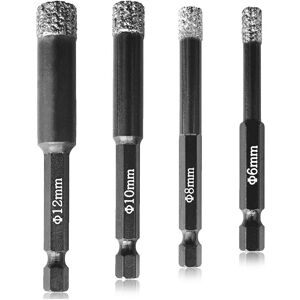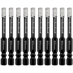 Each diamond drill bit has a built-in wax lubricant, which can melt and cool the drill tip, prevent diamond loss and extend the life of the drill bit. You can cool the drill bit after each hole to maintain optimal performance. The package includes 2 pieces 3/16 inch (5 mm) drill bits, 2 pieces 1/4 inch (6 mm) drill bits, 2 pieces 5/16 inch (8 mm) drill bits, 2 pieces 3/8 inch (10 mm) drill bits and 2 pieces 1. 2 inch (12 mm) drill bits. The combinations and quantity of 10 pieces for your long-term use and replacement. The built-in round shank is compatible with most popular electric drills, angle grinders and bench drills. The side groove design removes debris faster and the depth marks on the side are convenient for precise operations. The dry diamond drill bit adopts vacuum brazed diamond technology to drill clean holes in various types of tile, ceramic, porcelain, glass, marble, stone, masonry (not suitable for wood). Product Name: Diamond Drill Bits Color: Black Material: Diamond