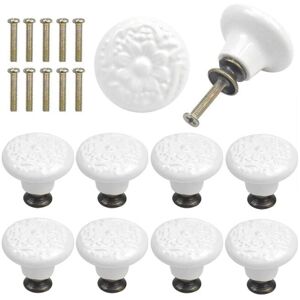 Color: White Material: Ceramic Size: 34 × 34 × 31 mm Package Contents: 10 × Knob, 10 × Screws -Delicate drawer handles refresh your furniture and add a touch of color to your home. -This vintage engraved round handle is widely used on cabinets, dressers, drawers and anywhere you want. -Installation is simple, just identify where you need to install it, drill holes and finally screw it into place.