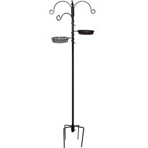 A great value bird feeding station, made from metal with a slightly bronze effect finish. The pole comes in 3 parts and slots together for simple home assembly, while the double feeder hook is attached to the top of the pole via a butterfly bolt that is easy to tighten and loosen. The water and mealworm dish attach to the pole via a clever wrap around mechanism that is effective, but also extremely easy to use and adjust. There is a rubber top finial that is not only decorative, but also serves a purpose, keeping water out of the pole. The dimensions of the feeding station are as follows: - 190 centimeters overall height - 52 centimeters width - 22 millimetres pole width Also included is a bird feeding station stabilizer stand