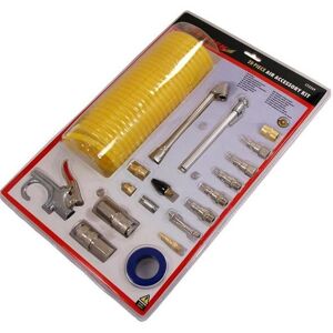 Neilsen 20pc Air Blow Gun Line Nozzle Accessory Fitting Gauge Compressor Kit Accessory includes: 2pc-quick coupler(steel) 2pc-female plug(steel) 4pc-male plug(steel) 1pc-double male connector 1pc-double female connector 1pc-tapered seal tape 1pc-air blow gun 1pc-tappered nozzle 1pc-blow gun nozzle 1pc-blow gun adaptor 2pc-needle inflator 1pc-dual-head tire chuck 1pc-air gauge 1pc-25ft.Memory recoll air hose