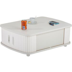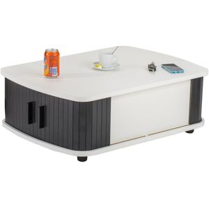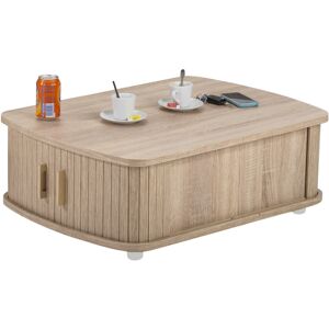 This coffee table comes with curved corners and four shutter doors. It has two storage compartments, one on each side. Each one is shuttered with two side sliding doors. Its structure is made from 16mm, top 25 mm, base 19 mm melamine particle boards of E1 quality. It is fitted with ABS plastic handles and four height-adjustable plastic feet. Symple Stuff Table Base Colour: Black, Table Top Colour: Oak