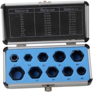 Positive Grip: Spiral cut teeth provide a positive grip to remove rounded or damaged bolts. Strong and Durable: Made of hard carbide, it is very strong and durable. Features: This is a set of 10 sturdy tools to help remove nuts, bolts, screw heads, studs, etc. Suitable Size: The damaged nut and bolt extractor is suitable for heads of sizes 9, 10, 11, 12, 13, 14, 15, 16, 17 and 19 mm. Easy Storage and Carrying: These tools can be equipped with a metric wrench or socket for quick work. All these tools are packed in a case for easy storage and carrying.