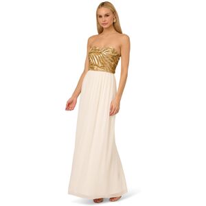 Get in touch with your inner goddess in this ethereal strapless ivory and gold dress. The beaded sweetheart bodice shimmers in a hand-applied feather-inspired pattern for a truly ethereal touch. The full-length pleated skirt is constructed with flowing georgette fabric. A back zipper closure ensures a fitted column silhouette. This is the gown to wear when you want to turn heads. Adrianna Papell Women's Beaded Strapless Long Dress in White Size: 18