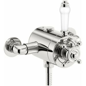 This traditional twin thermostatic shower valve kit is made from solid durable brass in a chrome finish with ceramic materials to give that classical effect. The solid brass riser rail comes with a 200mm brass shower head and an adjustable bracket for the handheld shower so you can move the shower head up and down to suit your height. The shower kit is complete with a traditional exposed valve with 3 main functions. The valve comes with two ceramic levers - the top controls the water flow and the water on/off for the main shower head and the bottom controls the water flow and water on/off for the handheld shower allowing you to use both outlets at the same time. The cross handles in the middle of the valve provides ease of use and allows you to control the temperature. With a 10 year guarantee for peace of mind Key Features Traditional twin exposed shower valve kit Traditional design 200mm brass shower head Handset with adjustable bracket Exposed valve for water and temperature