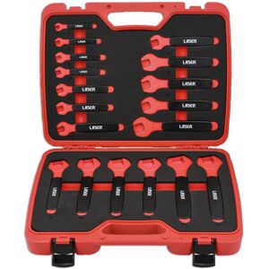 A comprehensive set of fully insulated open end spanners for use on modern hybrid and electric vehicles, including sizes from 7mm to 24mm, suitable for live working up to 1000V AC/ 1500V DC. The spanners are both GS and VDE certificated and manufactured according to the IEC60900 standard for safe use in a high voltage environment. The sizes are clearly marked on the side for easy identification and are supplied in a robust carry case for safe storage. Sizes: 7, 8, 9, 10, 11, 12, 13, 14, 15, 16, 17, 18, 19, 20, 21, 22, 23, 24mm. Safe operator use for live voltages up to 1000V AC / 1500V DC. VDE certified. IEC60900:2018 approved for 1000V safe working. Manufactured from Chrome Vanadium* with a Polypropylene (PP) & Thermoplastic rubber (TPR) cover. *8mm manufactured from Chrome Molybdenum. Supplied in a robust blow mould carry case with an EVA foam tray for safe storage.