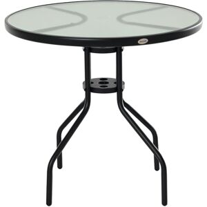"Create a simple yet inviting dining/holding space outdoors, thanks to this Outsunny bistro table. The steel frame creates a strong structure, with the long legs keeping balance at all angles. Fitted with a tempered glass tabletop for a solid holding place, the outdoor table features a middle hole to place and hold a parasol: your market umbrella will keep you shielded from the sun so you can enjoy outdoors for longer. A stylish duo design made for the seasons ahead. Specifications: ● Colour: Black ● Material: Metal, Tempered glass ● Product Dimension: Dia. 80 x 72H cm ● Tempered Glass Thickness: 5 mm ● Parasol Hole: Dia. 40 mm (Suitable to Ф38mm umbrella pole) ● Weight Capacity: 70 kg ● Custom Label: 84B-309 Features: ● 40 mm central hole for parasols - allows you to keep safely shaded from the sun ● Tempered glass table-top is solid and safe, textured finish for style ● Steel frame is strong, with long legs for balance ● Suitable for gardens, patios, conservatories and similar