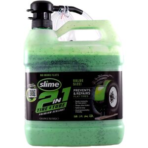 Does your tire have a tube inside, or is it tubeless? Who cares?! Slime's new 2-in-1 Tire & Tube Premium Sealant works to prevent and repair flats in all off-highway tires and tubes. It just works.Instantly seals up to 1/4´´ punctures in tires and 1/8 punctures in tubes Stops slow leaks Safe and easy Great for preventing flat tires in: bicycles, dirt bikes, ATVs/UTVs, golf carts, riding lawn mowers, small trailers, tractors, scooters and all other non-highway tiresSlime´s 2-in-1 Tire & Tube Premium Sealant seeks out and instantly seals tread area punctures up to a 1/4 in tires and up to 1/8 in tubes. When a puncture occurs, Slime's patented sealant is carried directly to the source. The pressure of the escaping air forces the particles into the opening, where they build up and intertwine to form a long-lasting, flexible plug.Instantly, air loss is blocked and a flat tire is prevented. Install in any of your tube or tubeless non-highway vehicles (including ATVs/UTVs, golf carts, riding lawn mowers, small trailers, tractors, scooters, bicycles, dirt bikes and much more) and enjoy two years of continuous flat tire protection. No more flats.Features:- Non-toxic, non-hazardous, non-flammable and non-corrosive, making it safe for tires and rims- Environmentally friendly and cleans up with water- Effective under the most extreme temperatures: Low freezing point of 14°F (-10°C) and a high separation point of 122°F (50°C)- Uses Fibro-Seal technology- Includes pump for easy installation. Dispenses approximately 1 oz per pump- Requires air