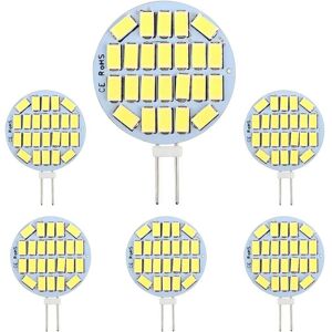 【AC12-24V】The input voltage of G4 LED bulb is AC12-24V, please use it in suitable voltage. Suitable for cabin, cabinets, RV lighting. 【Energy saving】G4 LED 3W Equivalent to 30w halogen bulb, saving 90% power consumption. Service life of up to 50000 hours, reducing the frequency of replacement, 6 packs are more durable, saving time and money. 【24x5730 SMDs】24pcs 5730 SMD, 300LM, provide you with enough lighting. Suitable for RV home kitchen lighting. Please note that this product is not dimmable. Not for use with dimmers. 【30x30MM】Standard G4 base, suitable for lamps with G4 base, bulb size 30*30MM. Easy to install without any tools, please make sure the bulb fits your lamp before purchasing. 【Application】Widely used in recessed lighting, cabinet lights, spotlights, furniture lighting, interior lighting. Suitable for cabinets, motorhomes, cabins, restaurants, offices, etc.