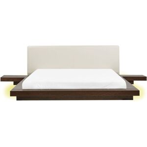 Platform Bed Frame with Nightstands. This sleek and minimalist low platform bed, inspired by Asian design, will simply transform your bedroom. High-quality MDF with a dark wood finish complements the faux-leather headboard. This elegant silhouette suits any modern interior. Functionality meets beauty as each side features floating nightstands, allowing treasured items to be kept close at hand, and the included LED lights will create a calming atmosphere in your bedroom. Details: Product Type: Double Bed Style: Scandinavian General Color: Brown, White Shade: Dark Brown Material Type: Wood Main Material: MDF Additional Material: Faux Leather Material Composition: 100% PU Leather Fabric Upholstered Back: No Finish: Wood Veneered LED: Yes Voltage rating: 220-240 V (50 Hz) Storage: No Dimensions: Headrest Dimensions: 220x86 Width: 328 cm Length: 229 cm Height: 86 cm Sleeping Surface: 180x200 cm Weight: 112 kg Weight Capacity: 350 kg Offer Includes: 2 x Nightstand, 1 x Slatted Frame (14