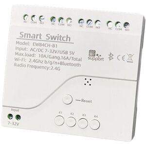 Features: App Support: For iOS and for Android mobile App . Sync Status: Real-time device status provided to App. Remote ON/OFF: Turn 4 electrical devices on/off remotely from anywhere. 3 Working Modes: Switch among interlock/self-locking/inching modes. control: Control each gang separately in APP . Supports remotely turn on or off connected appliances, for example light, electric kettle, electric rice cooker, electric curtain, etc. Use for 1.Remotely give a pulse signal to turn on/off Lights,Lamps and other home appliance. 2.Remotely give a pulse signal to turn on/off Garage Door,Door Access 3.Remotely give a pulse signal to control DC Motor,AC Motor to Forward and Reverse Parameters: lnput voltage: AC85-250V/USB5V Max.Current:2000W /10A/gang Max.load:3500W / 16A/4gang Wireless:Wi-Fi 2.4ghz b/g+Bluetooth Frequency radio:2.4G APP Remote Control: Just tap on eWweLink App to turn light anytime and anywhere. Color: White Material: ABS Different batches may have different printing