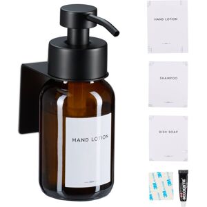 This practical pump dispenser is perfect for dispensing soap, lotion, shower gel, shampoo, or washing-up liquid. Thanks to its easy adhesive mounting, this liquid soap dispenser can be attached to the wall without drilling, saving space. The included labels help to clearly identify the contents. The stylish design of amber glass combined with black stainless steel makes the pump soap dispenser an elegant accessory for both the bathroom and kitchen. Soap Dispenser in Detail - Dimensions with holder H x W x D: approx. 16.5 x 6.5 x 12.5 cm - Dispenser dimensions H x W x D: approx. 16.5 x 6.5 x 10 cm - Volume: approx. 250 ml - Weight: approx. 300 g - Material: Glass, stainless steel - Colour: Black, brown Wall-Mounted Soap Dispenser without Drilling - Elegant design in amber glass and black stainless steel - Simple installation with the included 3M pad or tile adhesive - No drilling required - adhesive mounting protects ceramic tiles - Space-saving wall mounting for the bathroom and