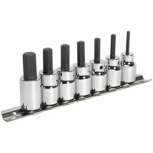 Sealey Premier Hex Socket Bit Set 3/8"Sq Drive 7pc Features: Drop-forged Chrome Vanadium steel sockets, hardened and heat treated with a fully polished mirror finish. S2 Steel hex bits with a blackened finish for resistance to corrosion. Bits feature no shoulder for easier access to recessed fixings. Sockets include 2mm hex setscrew allowing easy replacement of individual bits. Supplied on socket rail. Technical Details: • Drop-forged Chrome Vanadium steel sockets, hardened and heat treated with a fully polished mirror finish. • S2 Steel hex bits with a blackened finish for resistance to corrosion. • Bits feature no shoulder for easier access to recessed fixings. • Sockets include 2mm hex setscrew allowing easy replacement of individual bits. • Contents: 3, 4, 5, 6, 7, 8, 10mm. • Supplied on socket rail. • Lifetime guarantee*. • Model No. AK62253 • Model No. AK62253 Additional Information: • One of a comprehensive range of Premier Hand Tools, suitable for daily professional use. •