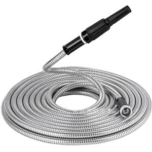 1.Ultra : Our hoses are constructed from a commercial-grade 304 stainless steel that is extremely , doesn't rust, is resistant to leaks, punctures and extended drags over tough surfaces, Hot Water Use: NO 2.Flexible and : The interlocking flex design is extremely flexible and easy to maneuver around tight corners, trees and other obstacles while remaining significantly lighter than commercial hoses 3.Weatherproof: The Hose has been built to withstand extreme conditions from temperatures, the hose can be freeze in a block of ice to being left in the sun for days and everything in between ensuring many years of reliable use 4.Fitting: The aluminum crush resistant fittings and stabilizer collar are engineered to withstand extreme force while the on/off valve makes the output easy to control 5. Free: The body of the hose is encased in a sturdy stainless-steel outer layer allows for a consistent, steady and high-pressure water output yet is memoryless, meaning it lay flat, resist , can