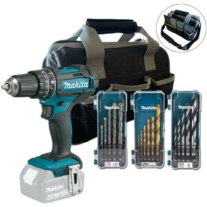 The DHP482 will drill into everything from plastic to steel and concrete as well as driving screws and fasteners with an adjustable 21 position clutch for engaging optimum torque, up to a maximum of 62Nm. Equipped with a twin LED worklight providing handy illumination for dark workspaces and dimly lit jobsites, the machine is fitted with a belt hook for hands free portability, while the handle and motor housing have softgrip rubber overmoulds to ensure a comfortable and controlled grip during use. Features & Benefits • Electric brake • 2 mechanical gears • Variable speed control by trigger • Forward/reverse rotation • Twin LED job light • Ergonomic soft grip • Keyless Chuck • Compact and lightweight design • Battery protection circuit • Metal gears Specifications • Battery Type: Lithium-ion • Battery Voltage: 18v • Blows per Minute (Hi): 0-28,500ipm • Blows per Minute (Lo): 0-9,000ipm • Capacity in Masonry: 13mm • Capacity in Steel: 13mm • Capacity in Wood: 38mm • Chuck Capacity: 1.5-13mm • Max Fastening Torque (Hard Joint): 62Nm • Max Fastening Torque (Soft Joint): 36Nm • No Load Speed (Hi): 0-1,900rpm • No Load Speed (Lo): 0-600rpm • Noise K Factor: 3dB(A) • Noise Sound Power: 93dB(A) • Noise Sound Pressure: 82dB(A) • Torque Settings: 21 + drill • Vibration Drilling Into Metal: 2.5m/sec² • Vibration Impact Drilling Into Concrete: 6.0m/sec² • Vibration K Factor: 1.5m/sec² • Net Weight: 1.8kg Contents • Makita DHP482 18v LXT Cordless Combi Drill • Belt Clip • Makita BL1850B 18v LXT Cordless Li-ion 5ah Battery (x2) • Makita DC18RC 18v Li-ion Battery Charger • Makita MakPac Type 2 Connector Case • Makita 21 Piece ScrewDriver Bit Set in Battery Case