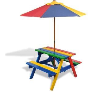 This fantastic 2 in 1 kids wooden picnic table & bench is a great way to allow your little ones to play games or have a cool drink with their friends on the sturdy and colourful table, while the parasol protects them from the strong sun in summer days. This picnic set is extremely popular among children because of its adorable rainbow colour, the attractive parasol and the comfortable benches on both sides. Colour: Red/yellow/blue/green Table set material: Fir wood Parasol material: Fir wood/polyester Parasol diameter: 120 cm Table set dimensions: 75 x 85 x 52 (L x W x H) cm Maximum capacity: 60 kg Fabric: Polyester: 100% 1.WARNING: Not suitable for children under 36 months. 2.WARNING: Only for domestic use. SKU: 40773 Warning. Not suitable for children under 3 years. Small parts. Choking hazard. EU responsible party Haba Trading B.V. Mary Kingsleystraat 1 5928SK Venlo The Netherlands Compliance-safety@vidaxl.com