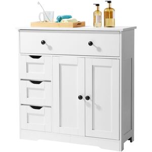 Organized Bathroom Storage This high-quality MDF bathroom floor cabinet offers a practical solution for organizing essentials such as tissues, soap, towels, cosmetics, and shower supplies. Featuring an adjustable shelf, it accommodates diverse storage requirements. The cabinet is designed for easy assembly with pre-drilled holes and clearly numbered parts. Its clean white finish blends seamlessly with different interior styles, making it a versatile choice for bathrooms, entryways, or even as a compact bookshelf. Enhance your living space with this functional and stylish storage option. Generous Storage Capacity Customizable Shelf Levels Durable and Water-Repellent Surface for Hassle-Free Cleaning Secure and Steady Design with Anti-Tip Mechanism Multi-Purpose Storage Solution for Your Home Key Features Ample Storage Space: With dimensions of 11.8x31.5x31.9 inches, this bathroom floor cabinet features four drawers and three shelves, providing a practical solution for organizing towels,