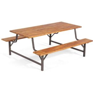 Do you need furniture for your outdoor gatherings? If yes, our picnic table bench set will be a great choice for you! To fit the outdoor environment, this outdoor dining table and bench set is made of solid acacia wood and rustproof metal frame which is durable and stable enough for better outdoor performance. If you need shade, just insert the patio umbrella (not included) in the 4.5cm umbrella hole for great convenience. After that, the large tabletop is ready to accommodate delicious food while 2 widened benches support 6 people at the same time. Therefore, this patio dining table and bench set will be an indispensable choice for your outdoor gatherings. Features: Deliver in 2 boxes (screws in box 2), so the arrival time may vary Solid acacia wood for high durability Add a rustic touch to outdoors Easy to clean with burr-free surface Ensure stronger stability with the support of the sturdy and anti-rust metal frame Hold up to 160 kg for the table and 360 kg for each bench