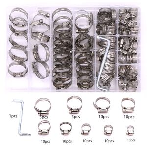 【High Quality Material】Our metal hose clamps are made of 201 stainless steel, which is high hardness, durable, not easy to rust and with non-corrosion characteristics. Our hose clamp with solid construction and fine workmanship, no rust. It will still look new after a long time of use. 【Perfect Hose Clamp Set】The hose clamp is flexible and ductile with a wide adjustable size range from 8mm to 38mm. Contains 7 different sizes: 8-12mm, 10-16mm, 13-19mm, 16-25mm, 19-29mm, 18-32mm and 25-38mm for each type, 81pcs in total, enough for daily life replacement and replacement. 【Easy to Use】The stainless steel hose clamp is easy to use. Easy to loosen the screw of the hose clamp with a screwdriver, then pass the hose through the hose clamp and adjust the appropriate size, tighten the screw, easy even for beginners. 【Wide Applications】The package includes 81pcs hose clamp, 1pcs z wrench and a storage box. Apply for fixing hoses, pipes, cables, pipes, fuel lines in household, automotive,