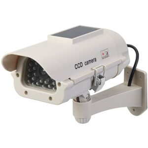 Easy to Install Solar Powered Dummy Security Camera with Flashing LED Extremely realistic, easy to install and helps deter intruders Waterproof for indoor and outdoor use Mounted on an adjustable stand Requires 2 rechargeable AA batteries 1 x Solar Powered Dummy Security Camera with LED