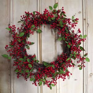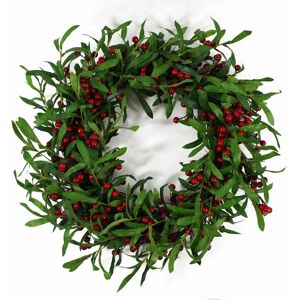 60cm (24") grand Christmas wreath adorned with mistletoe leaves and natural red berries, exuding a luxurious and festive charm. Crafted on a natural woven base, this wreath boasts silk leaves and a large, dense design overflowing with vibrant foliage. Perfect for all door sizes, this wreath is a statement piece that will elevate your holiday decor to new heights of elegance. This product is designed for indoor use only.