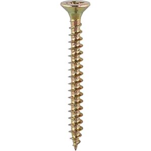 The Solo Countersinking Pozi Wood Screws are a single thread woodscrew mainly used in various types of timber and man-made boards or into masonry with the use of a plastic plug. Features & Benefits • Double countersunk reduces the likelihood of head shear and assists completion of countersinking • Wax lubricated to enhance screw insertion time, extra driving torque and resistance to corrosion • 40° deep single thread to provide a secure fixing with high pull-out resistance • 25° sharp point and single lead for a fast start and improved thread acceptance Specifications • Pack Dimensions L x W x H: 180 x 90 x 90mm • Material: Carbon Steel • Lubrication: Wax • Head Type: Double Countersunk • Gauge: 12 • Point Type: 25° Sharp • Finish: Zinc & Yellow • Length: 70mm • Thread Diameter: 6mm • Head Diameter: 11.57mm • Substrates: Softwood, Chipboard, MDF, Masonry (with plug) • Quantity: 200
