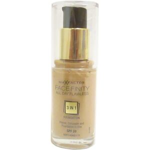 Facefinity All Day Flawless 3in1 Soft Honey from Max Factor contains both primer concealer and foundation in one bottle. The 3in1 combination creates a uniform colour and a natural matte finish for flawless skin. Furthermore, it contains SPF 20 so the skin is always protected from the sun's rays. Information: Brand: Max FactorSeries: Facefinity Type: FoundationNuance: Soft Honey 77Content: 30ml