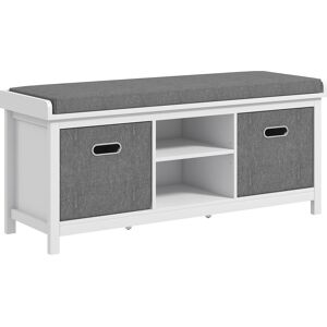 It's time to organize your shoes with our shoe rack bench from HOMCOM. Two cabinets and a compartment with an adjustable shelf provide enough storage space for shoes. Besides, the top cushioned seat allows you to get rid of the trouble of changing shoes when leaning against the wall before going out. The combination of clean white lines and grey fabric makes it pair well with any decor in your room. Keep your shoes neatly and tucked away with our HOMCOM window seat.Features:Breathable linen-feel fabric cushion offers you a cosy sitting experienceCushion cover with zip is removable and washableTwo cabinets and 2-tier shelf provide enough shoe storage3-level adjustable shelf can be removed for shoes of different heightsMelamine coated particleboard is easy to cleanAssembly required