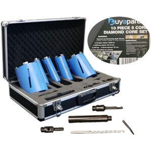 10 Piece Diamond Core Set Features: This 10 piece Diamond Core set it suitable for cutting, Granite, marble, limestone, slate, hard bricks and other dense and non-abrasive materials. Encompasses the industries most popular core sizes to suit Electricians, Plumbers and other major trades Laser welded diamond cores are designed for fast and easy drilling, in the most demanding of situations. Trade quality and fully compatible with Makita, Dewalt, Bosch and Milwaukee core drills Kit contains: 38, 52, 65, 117 and 127mm Cores ideal for common industry construction jobs such as coring for boiler flues, soil stacks, air vents, ventilation and either industrial 5Inch pipe. Includes 5 x Core Drills 5 x Accessories 1 x Aluminium carry case with foam insert 1 X 115MM Diamond Blade