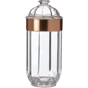 The rose gold band on its rim adds a warm metallic accent to this clear acrylic canister. Its interior surface boasts a fluted design which subverts the smooth exterior while magnifying the contents. The domed lid features a small handle and an airtight seal, with corresponding fluting detail on its inner.