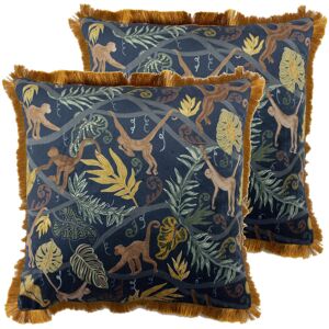 Bring “♫ I wanna be like you ♫” to life with this stylish and exotic velvet cushion. Featuring a playful, exquisite print of monkeys, vines and tropical palms – this bold cushion is an eye-catcher. The rich midnight blue background allows the funky print to stand out alongside the fringed edging. This design is certainly a showstopper and would be a great feature to any décor.