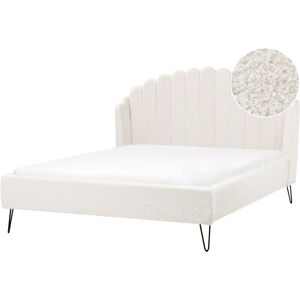Bed Frame with Shell Headboard. Meet the bed you dreamed of. This boucle-upholstered beauty in a retro-inspired look will be the statement piece of any bedroom. Complete with sturdy hairpin legs and a channel-tufted shell headboard, it will introduce a glam feel to the interior. The bedhead is winged, creating a cosy space for watching your favourite shows or nighttime reading. The set also includes a slatted base that ensures stable support for a mattress. Details: Product Type: Double Bed Style: Retro General Color: White, Black Shade: Off-White Material Type: Fabric Main Material: Boucle Additional Material: Plywood Material Composition: 100% Polyester Fabric Upholstered Back: No Dimensions: Headrest Dimensions: 181x106 Width: 197 cm Length: 214 cm Height: 126 cm Sleeping Surface: 180x200 cm Weight: 56 kg Weight Capacity: 250 kg Offer Includes: 1 x Bed Frame, 1 x Slatted Frame (30 Sprung Slats), Not Included: Mattress, Bedding and Cushions Key Features: Comfortable and Wide