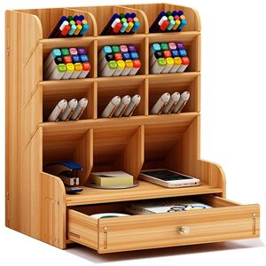 The desk storage box; essential in the office for storing types of items Perfect solution for home or at work, to keep a tidy space mess on your desk. Also good for organizing make-up and small items; ; keep pens, Sticky Notes, paper clips, etc. in one place Colour:Yellow Material:Wood Size:21x15x25.5cm Package Contents: 1* Chest of drawers Only the above package content, other products are not included. Note: Light and different displays may cause the color of the item in the picture a little different from the real thing. The measurement allowed error is +/- 1-3cm.