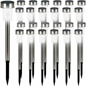 Weatherproof solar lights made from stainless steel that charge automatically during the day and automatically turn on at dusk. Multifunctional: for garden, terrace, patio, lawn and yard. Durable: Modern LED technique with rechargeable battery Practical: Easy installation with stable ground stake Product advantages: - Colour changing LEDs - Rechargeable battery - Powerful solar panel - Weatherproof and robust - Stainless steel - Automatic turn on / off at dusk and dawn - Additional on and off button Technical data: - Material: Stainless steel and plastic - Total height 36,5 cm - Solar powered - Light colour: Warm White Scope of delivery: 24x Solar lights