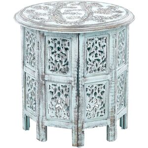 Oriental Style Distressed Table. Complete your interior with a decorative yet also functional piece of furniture that will work well in both the living room and bedroom. This side table was handcrafted with attention to detail from natural mango wood, making it extremely stable and durable. Carvings covered with white paint perfectly harmonise with the visible distressed effect, which makes the product look vintage. Details: Product Type: Side Table Style: Retro General Color: Brown, White Shade: Off-White Material Type: Wood Main Material: Mango Wood Legs material: Wood Top Material: Wood Shape: Round Finish: Painted Storage: No Dimensions: Width: 45 cm Length: 45 cm Height: 43 cm Weight: 4 kg Weight Capacity: 13 kg Offer Includes: 1 x Side Table Key Features: Decorative Yet Functional, Eye-Catching Accent Piece, Stable and Durable Construction, Unique Handmade Piece, Takes Up Little Space Assembly Information: Partial Assembly Required. 5-15 min. Additional Information: Distressed