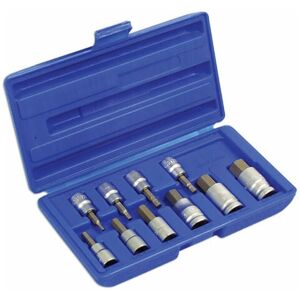 A set of stubby single Hex socket bits from 4mm to 19mm in three drive sizes. 1/4""D socket bits: 4, 5, 6, 7, 8mm. Length: 30mm. 3/8""D socket bits: 10, 12, 14mm. Length: 36mm. 1/2""D socket bits: 17, 19mm. Length: 46mm. Sockets manufactured from satin finish chrome vanadium, bits from impact grade S2 steel (14mm from CV steel). Supplied on a socket rail.