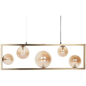 Glam Decorative Ceiling Lamp. Experience the charm of an elegant pendant lamp, where sophistication meets artistry. The metal brass frame, exquisitely glossy and openwork, elegantly houses five delicate glass globe shades. The piece owes its colour to the e-coating finish technique which also guarantees extra durability. Let this sophisticated composition add an elegant touch to your home decor. Details: Product Type: Pendant Light Style: Modern General Color: Brass Material Type: Metal Main Material: Iron Additional Material: Glass Shade Material: Glass Wattage: 9 W Finish: E-Coating IP Protection Code: IP 20 Light Bulbs Required: 5 Voltage rating: 230 V (50 Hz) Dimensions: Cord Length: 85 cm Depth: 20 cm Width: 100 cm Height: 133 cm Weight: 4 kg Offer Includes: 1 x Ceiling Lamp, Not Included: Light Bulb Key Features: Works Splendidly as an Ambient Light, Eye-Catching Accent Piece, Blends Well with Any Decor, Trendy Design and Colour, High Quality Assembly Information: Full Assembly