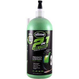 Does your tire have a tube inside, or is it tubeless Who cares Slime's new 2-in-1 Tire & Tube Premium Sealant works to prevent and repair flats in all off-highway tires and tubes. It just works.Slime´s 2-in-1 Tire & Tube Premium Sealant seeks out and instantly seals tread area punctures up to a 1/4 in tires and up to 1/8 in tubes. When a puncture occurs, Slime's patented sealant is carried directly to the source. The pressure of the escaping air forces the particles into the opening, where they build up and intertwine to form a long-lasting, flexible plug.Instantly, air loss is blocked and a flat tire is prevented. Install in any of your tube or tubeless non-highway vehicles (including ATVs/UTVs, golf carts, riding lawn mowers, small trailers, tractors, scooters, bicycles, dirt bikes and much more) and enjoy two years of continuous flat tire protection.Features:- Instantly seals up to 1/4´´ punctures in tires and 1/8 punctures in tubes- Stops slow leaks- Safe and easy- Great for preventing flat tires in: bicycles, dirt bikes, ATVs/UTVs, golf carts, riding lawn mowers, small trailers, tractors, scooters and all other non-highway tires.- Non-toxic, non-hazardous, non-flammable and non-corrosive, making it safe for tires and rims- Environmentally friendly and cleans up with water- Effective under the most extreme temperatures: Low freezing point of 14°F (-10°C) and a high separation point of 122°F (50°C)- Uses Fibro-Seal technology- Requires air