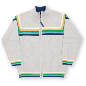 This trendy yet timeless style certainly brings cool vibes. A knitted 'bomber jacket' style, featuring a classic grey marl body with rainbow self knit sleeve and hem stripes for that pop of colour, this midweight zippy is one of our favourites here at Kite HQ.