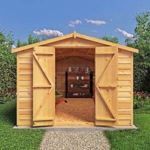 Part of our Garden Value range of overlap sheds. Double doors provide easy access to the entire space. This handy shed is manufactured from high grade, slow grown, FSC approved, European pine cladding boards over 34mm square framing with OSB roof and floor. No windows for added security. Features: Great storage at an affordable price Attractive rustic appearance Paddlock friendly hasp & staple All timber slow grown far North for highest quality Dip treated base coat preservative All fixings, roof felt and assembly instructions are provided Proudly made in the UK Dimensions & Weight: Dimension: L239 x W359.1 x H194.2 cm Footprint nearest ft: 12x 8 Footprint actual: 11'9" x 7'10"g Internal Width: 3523 Internal Depth: 2322g External Footprint: L2390g x W3591 Extreme Depth: 2565g Extreme Width: 3696 Internal Ridge Height (mm): 1847 External Ridge Height (mm): 1942 Internal Eaves Height (mm): 1558 External Eaves Height (mm): 1603 Weight: 239 kg Notes: Our estimated lead times are for the