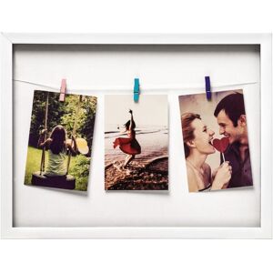 This washing line frame is a fun and novel take on the traditional photo frame. Use one of the colourful pegs to clip a photograph to the washing line. The plastic frame is light and hard-wearing, its white finish providing a neutral border for the photographs. Capable of displaying three pictures, it's possible to present a theme or just mix and match images.