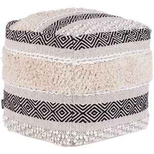 Boho Square Pouffe. This square pouffe makes an ideal additional seat in the living room, a comfortable footrest, or a decorative piece. Wrapped in a soft, cotton cover in shades of white, light beige and black, it adds warmth and cosiness. The eye-catching, diverse texture combined with a geometric pattern creates a boho effect, perfectly matching interior in eclectic, vintage or modern style. Details: Product Type: Pouffe Style: Traditional General Color: Beige, Black Shade: Light Beige Material Type: Fabric Main Material: Cotton Filling Material: EPS Beads Material Composition: 100% Cotton Shape: Square Pattern: Geometric Pattern Storage: No Dimensions: Depth: 50 cm Width: 50 cm Height: 50 cm Seating Surface: 50x50 cm Weight: 3 kg Weight Capacity: 120 kg Offer Includes: 1 x Pouffe Key Features: Perfect for Both a Bedroom and a Living Room, Retro Style, Solid Craftship, High Durability, Multifunctional Assembly Information: Does Not Require Assembly Maintenance tips: Cotton: 1.Clean