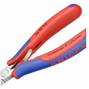 64 42 115 Electronics End Cutting Nipper Precision pliers for ultra fine cutting work, e. g. in electronics and fine mechanics. Sturdy, zero backlash box joint. Low-friction double spring for smooth and even opening. The polish or mirror polish together with a fine film of oil offer effective rust protection - no circuit faults caused by peeling chrome from plated tools. Cutting edges additionally laser-hardened, cutting edge hardness approx. 56 HRC. Oblique End Cutter, short head, with small bevel, α = 27°. - Cutting capacities soft wire (diameter): Ø 1.5mm- Cutting capacities medium hard wire (diameter): Ø 1.0mm- Cutting capacities hard wire (diameter): Ø 0.5mm- Head width (A): 11mm- Jaw length (B): 10mm- Jaw thickness (joint) (D): 7mm- Cutting edge length mm (C): 12mm